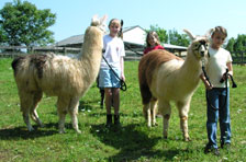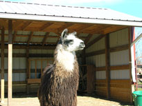 Llamas, because of their curiosity, have a delightful habit of coming close to sniff strangers. But despite our natural temptation to hug and cuddle them, they prefer not to be petted except on their necks and backs. They usually are safe around children and rarely bite or kick unless provoked. |