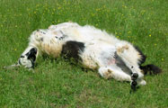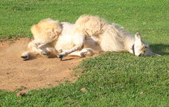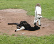 Dung-piling behavior is an important means of marking territory and a convenience when you clean their pens. Keeping your dung areas cleaned up encourages the llamas to keep them small. It also helps with parasite control and can make you very popular with local gardeners! Llamas also love to roll in the dirt, taking a dust bath to help maintain a healthy, fluffy coat of wool. No need to create a dirt area—they usually find a thin spot and by consistently going there to roll, create their own! |